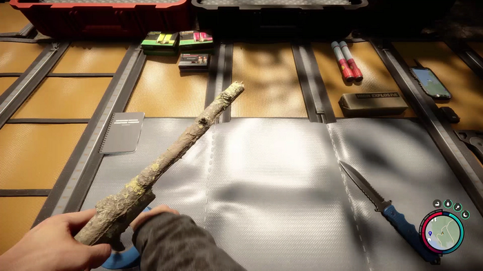 棒、石、骨などの基本的な素材を集めたら、それらを接着します。 「I」キーで在庫を開き、キットを地面に置き、商品のコレクション全体を表示します。