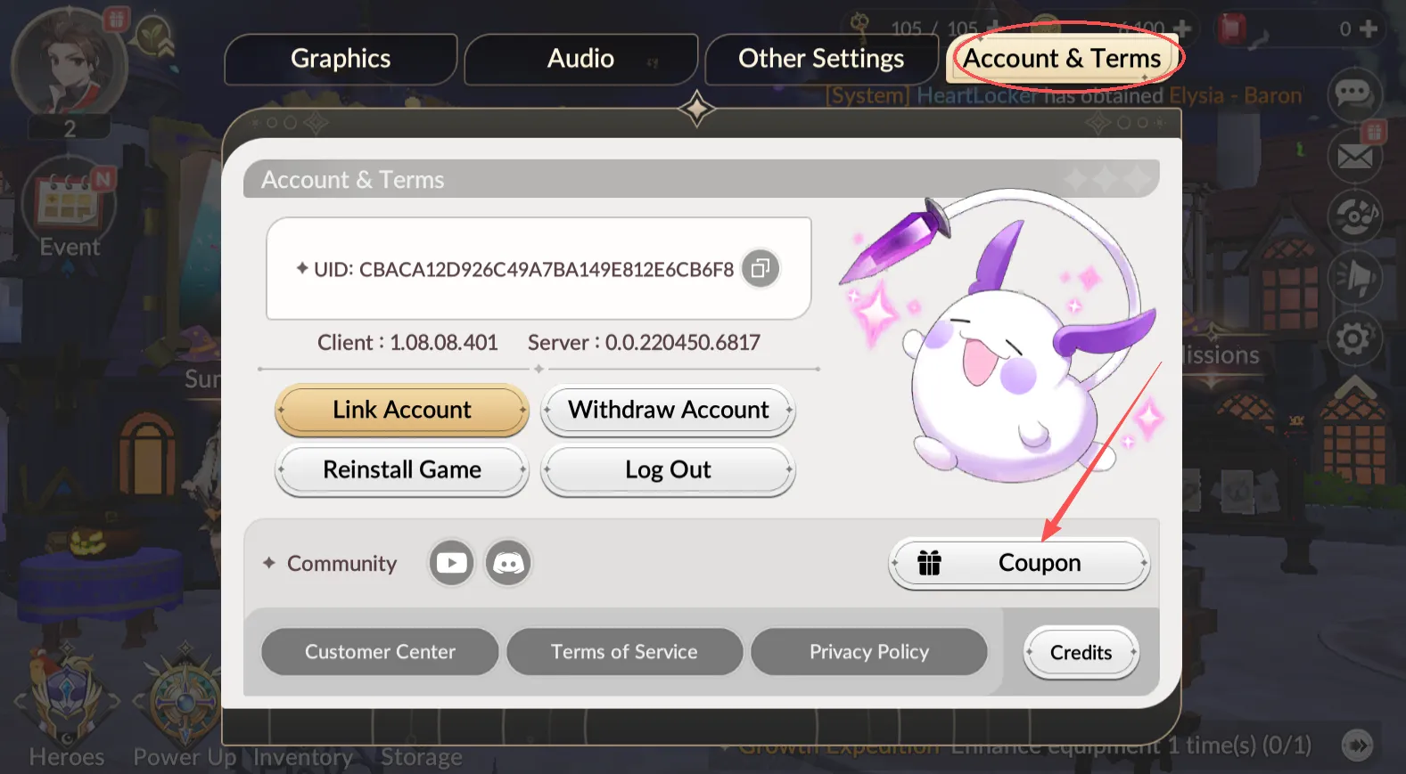 - 「アカウント」を選択し、 クーポン ボタンを押して引き換えウィンドウを表示します。