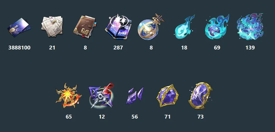 思考の破片 x7 ファイアリースピリット×2 スターファイアのエッセンス x12 印象の欠片×11 天空の焼却炉 x26 欲望の欠片×6 未定×2 運命の軌跡×2 クレジット x539,000 |