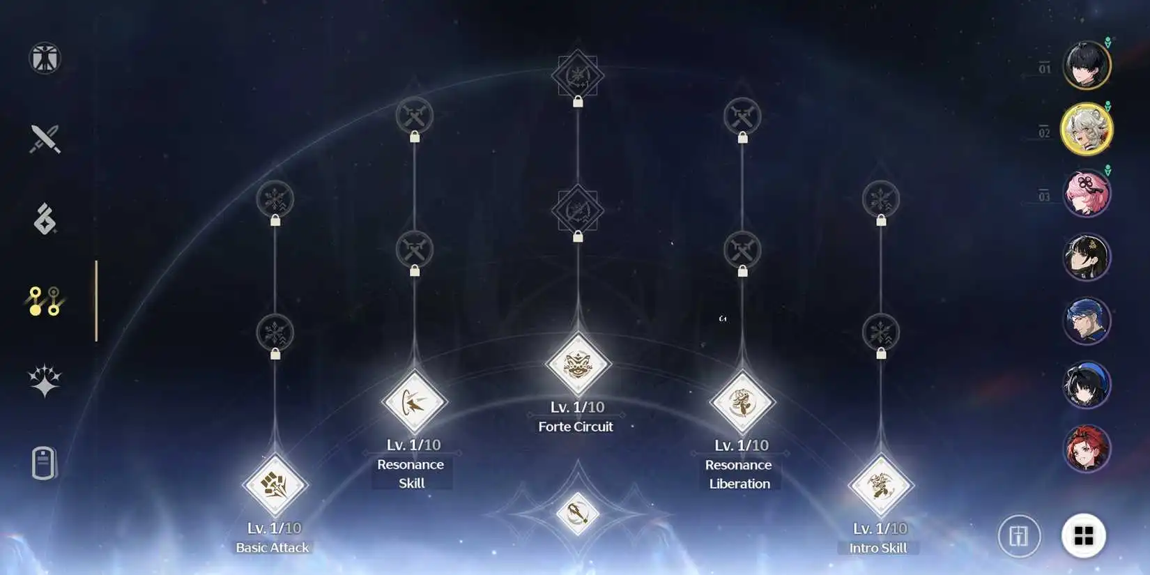 固有スキルは強力なパッシブ効果を提供するため、リソースが許す限りアップグレードする必要がありますが、アクティブ スキルと同じマテリアルを消費しません。彼の Resonance Liberation の主な価値は、Striding Lion を有効にして DMG ボーナスを提供することにあり、直接的なダメージ スケーリングの優先順位は低くなります。イントロ スキルは最も影響の少ないアップグレードを提供するため、最後にレベルを上げる必要があります。