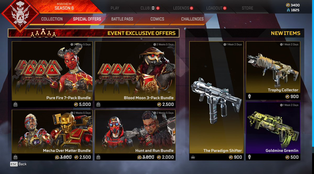 このイベントのバンドルとスキンには、リカラースキン、Apexパックが含まれ、戻ってきたParadigm ShifterR-99スキンがストアにあります。
