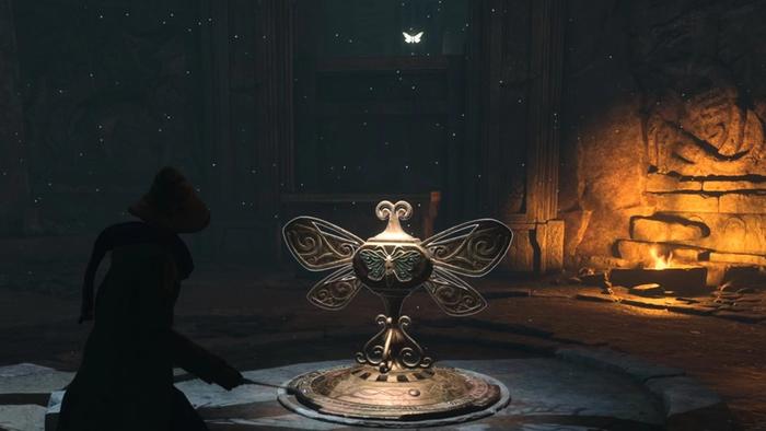 ヘルム オブ ウルトコット クエストの最初のステップでは、一連の蝶々がいる巨大なドアに出くわします。 最初のドアの場合、ドアの近くにいない蝶の近くにいるときにルモスをキャストします。 Lumos を使用すると蝶が杖に引き寄せられ、L2/LT を長押しすると蝶をドアに誘導できます。