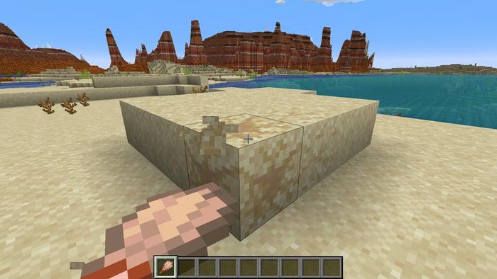 ブラシを使用して、下にある宝物から砂を非常に注意深く、非常に繊細に払いのけます。 他のものでブロックを採掘しようとすると、シルク タッチでも破壊されます。 下のブロックが採掘されると、壊れることさえあります。 ちゃんと発掘すれば色々な物が手に入るんだけどね!
