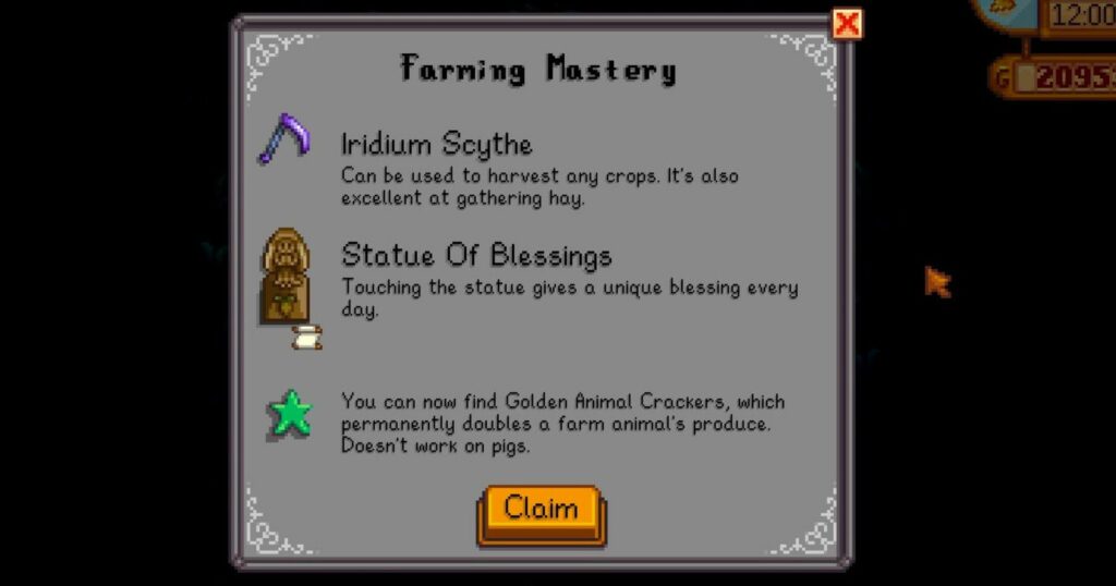 これらのスキルには、釣り、採掘、採集、戦闘、農業が含まれます。 10,000 ポイントを集めるとバーが埋まり、最初のマスタリー ポイントを獲得できます。 このポイントは、マスタリー洞窟でイリジウムの鎌と引き換えることができます。