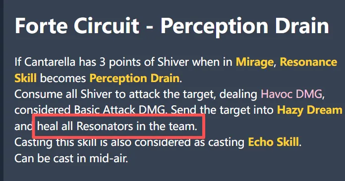 カンタレッラのスタッキングは彼女のユニークさに依存します ミラージュ そしてトランス/シバーシステム。彼女はイントロ スキル、レゾナンス スキル、レゾナンス リベレーションを使用してミラージュに入り、その後、少なくとも 2 つのバリエーション スキル、フリッカリング レヴェリーとパーセプション ドレインを解き放つことができます。どちらもエコー スキルとみなされます。このメカニズムにより、彼女のスタッキングが比較的長いながらも自立したコンボ全体に分散され、ガルブレナに次のような効果が提供されます。 Afterflameスタックのスムーズで持続的かつ予測可能な蓄積。