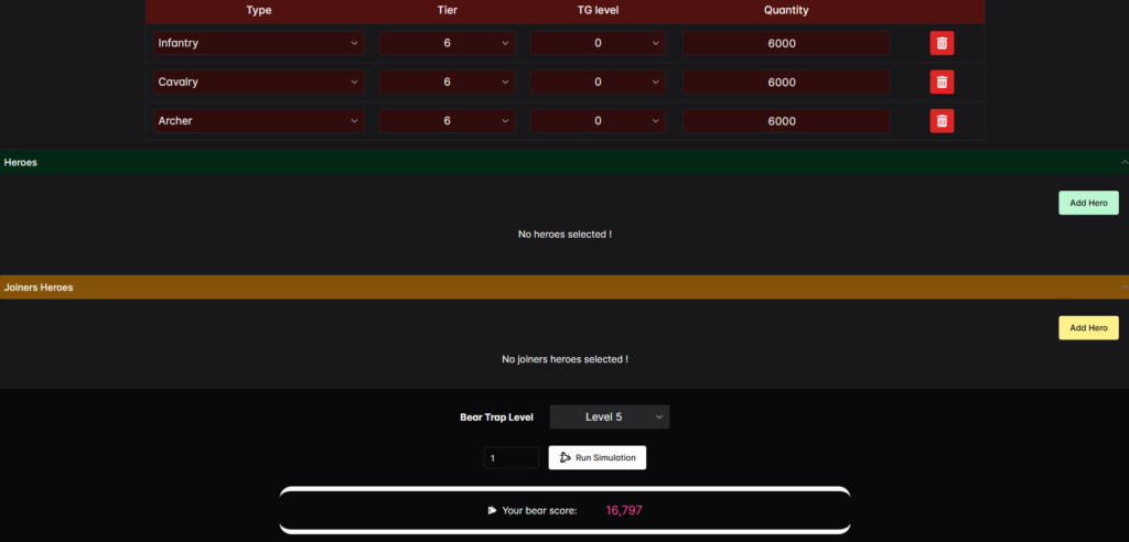 - あなたがベアに与えるダメージは、10 ラウンドにわたる 3 つの兵種すべてからの合計です。チャンスベースのヒーロースキルが関与していない場合、部隊はベアバトルで死亡せず、ヒーロースキルがなくてもSkillModは1のままであるため、ダメージは一定のままです。