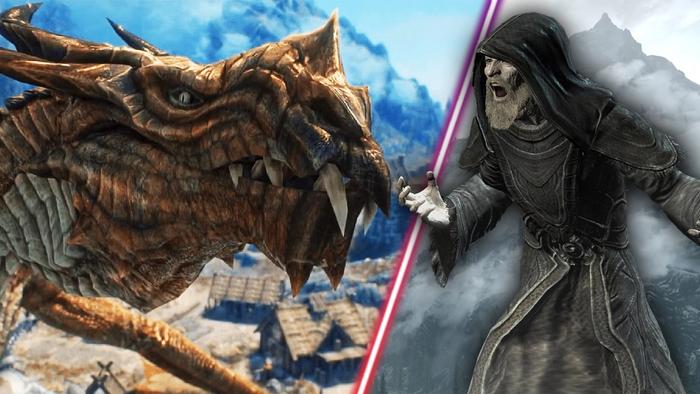 Skyrim のファンは 2 つの異なる選択肢に分かれており、プレイヤーはそれぞれの間で非常に積極的に主張しています。 一方の側には 2 人のグレイビアードまたはエルフが向かい合っているのが見え、もう一方の側にはドラゴンの頭を上から見下ろすように見えます。