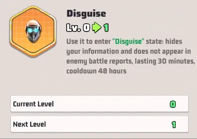 - 変装: 自分の情報を非表示にし、敵の戦闘レポートから除外します。偵察、奇襲、または戦力の隠蔽に非常に戦術的です。