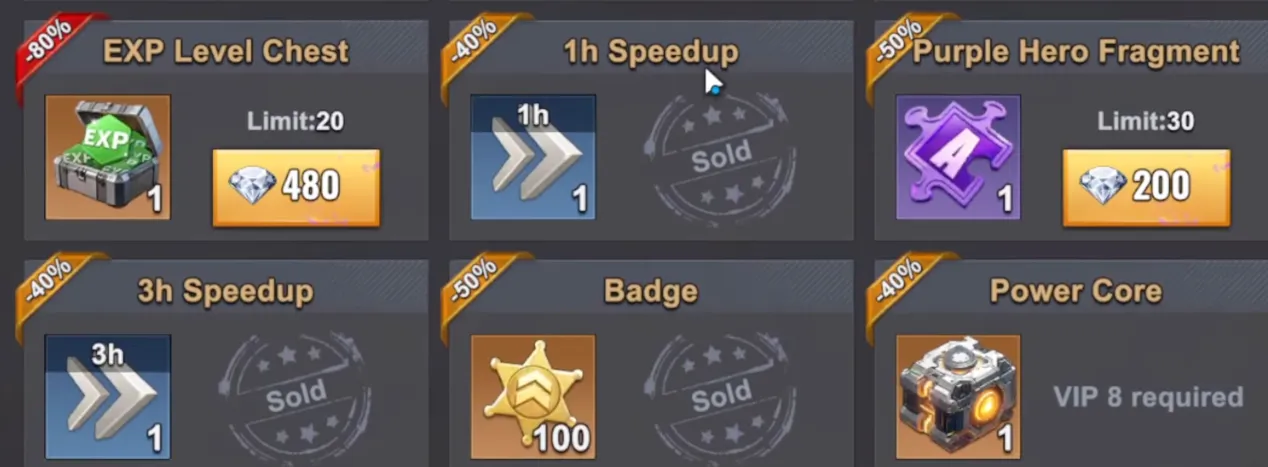 - スキップ: パープルヒーローフラグメント、ダイヤモンドで直接購入したスピードアップ、および パワーコア。
