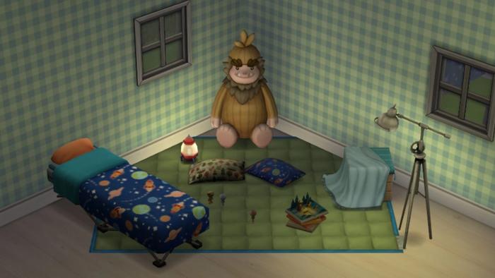 いくつか例を挙げると、巨大なビッグフットのおもちゃ、敷物、座席、ファイヤーピットがあります。 最も重要なのは、シートとフェアリーライトで作られたプロジェクタースクリーンです。 これは非常に家庭的で狡猾な感じを追加し、シムにもう少し人間味を感じさせます。 彼らが集まってセットアイテムを作るのを想像するのは楽しいです。 ちなみに、新しく追加された望遠鏡(リアルなプロポーション)は、リトルキャンパーに付属のテントにぴったり収まります。