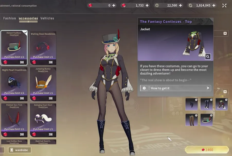 - Black Tea & Rose、Curtain Fall、Carnival Never Stops、Fantasy Continues のセットは通常、トップスとボトムスが分かれており、手袋、靴、帽子が付属します。これらの完全なパッケージのほとんどの価格は約 1,460 ローズ オーブです。