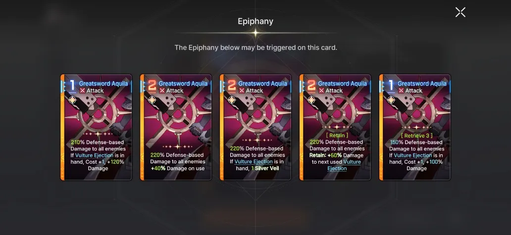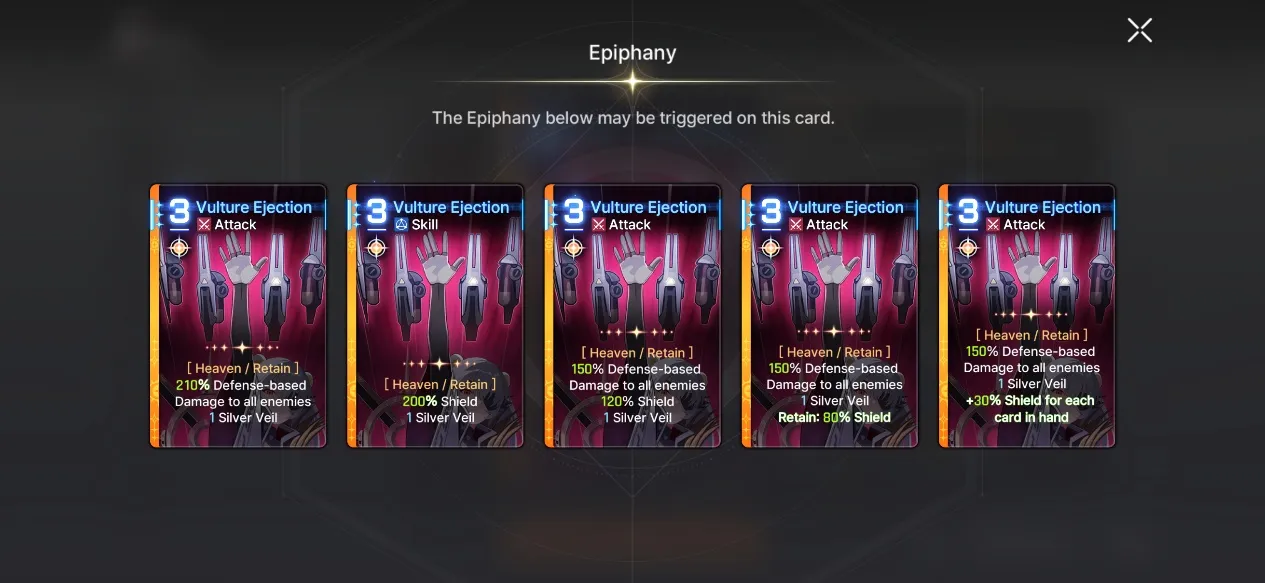 効果: 敵全体に150%の防御ベースのダメージを与えます。手札に「ハゲタカ・イジェクション」がある場合、このカードのコストは1増え、ダメージは100%アップする。