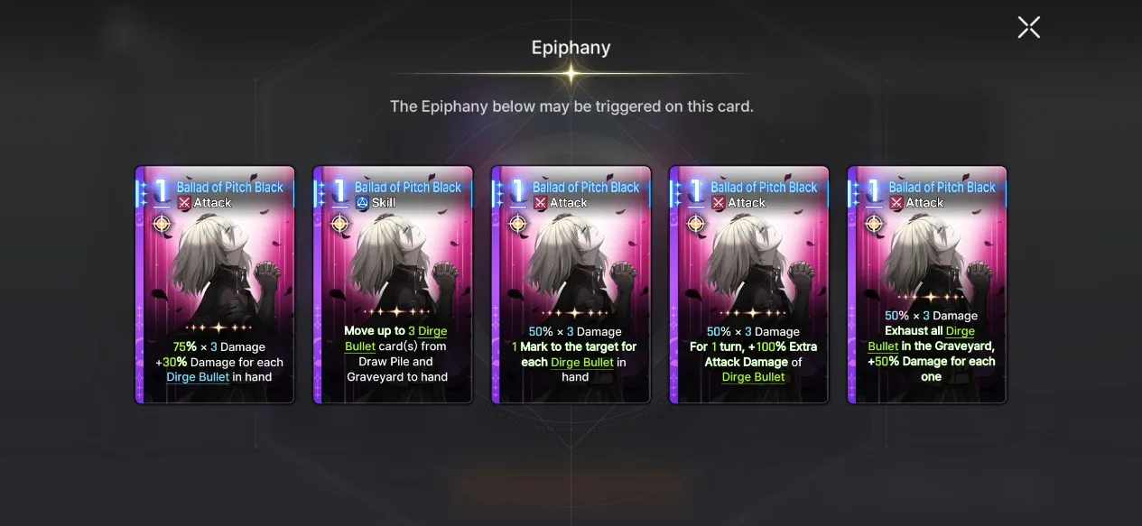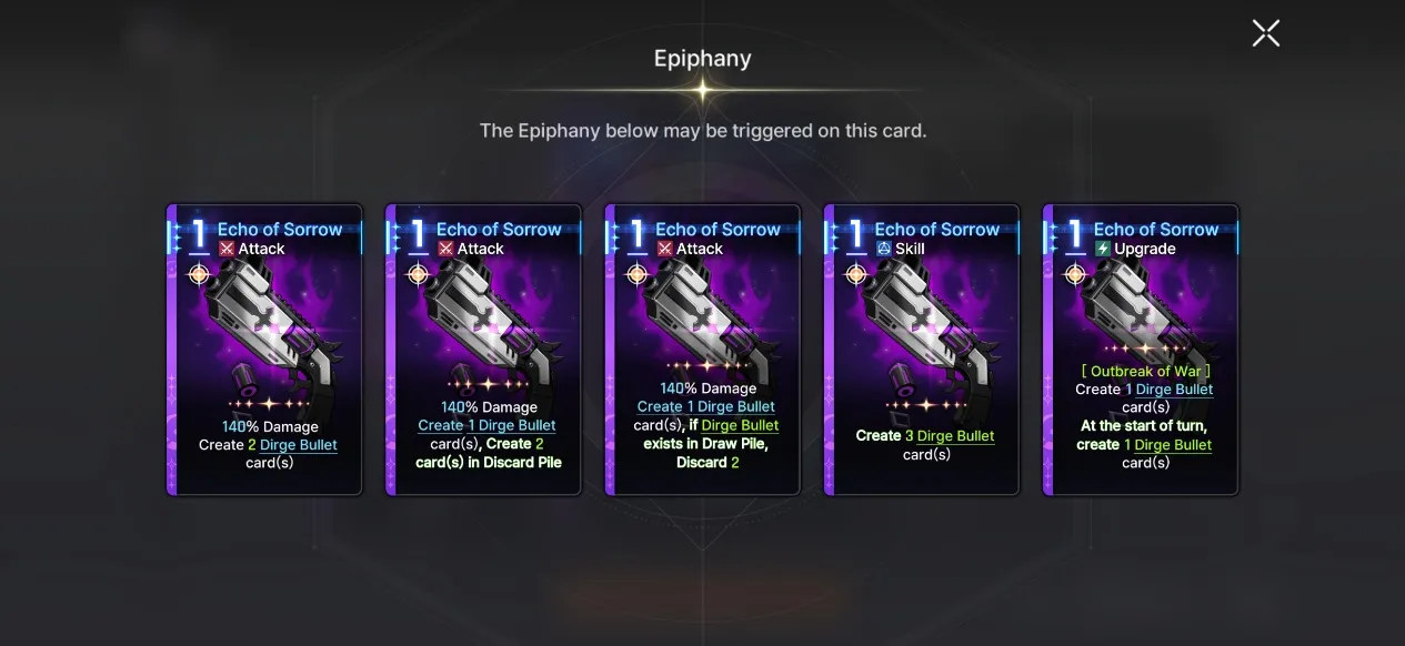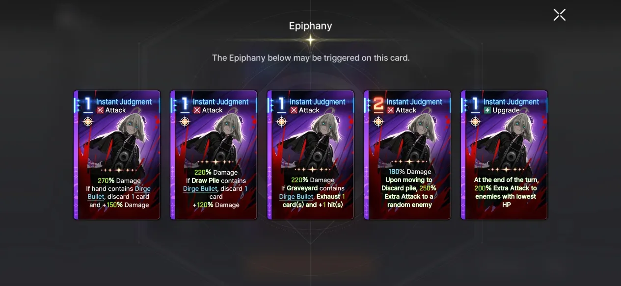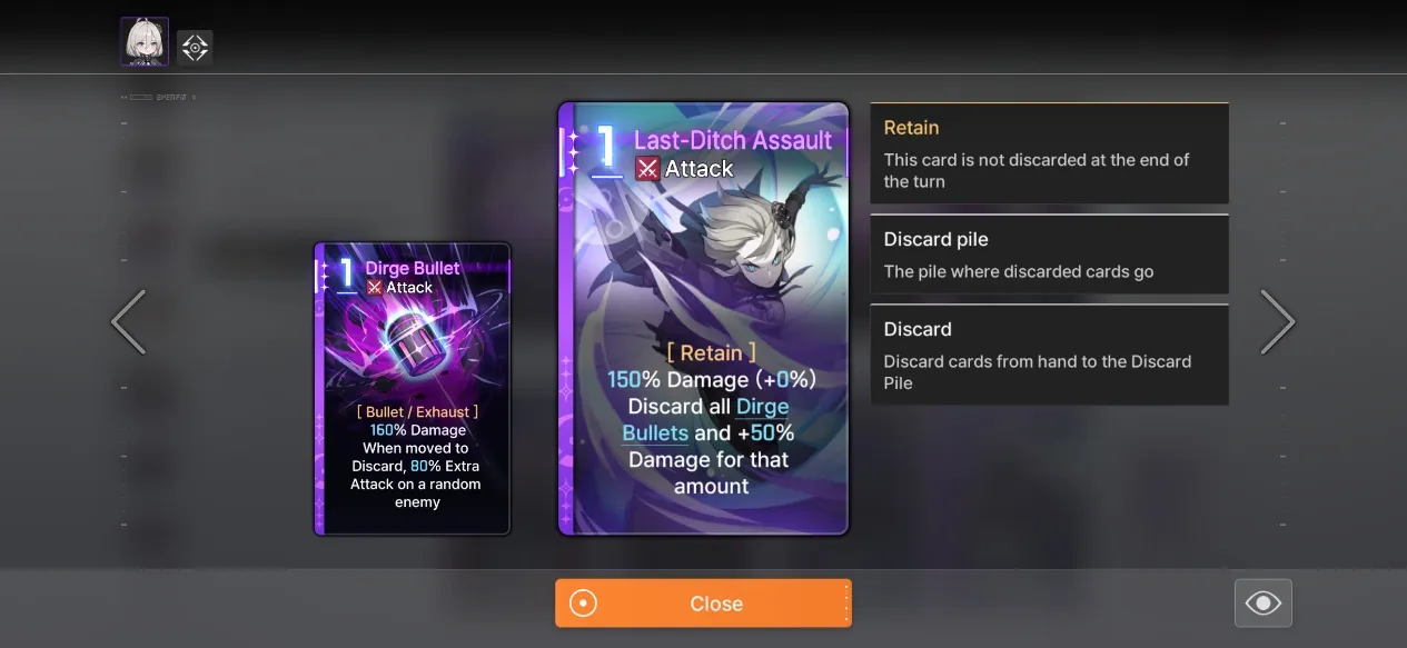 - 最後の攻撃: 戦いを終わらせるエース。このカードには、 “保持” キーワードを最適な瞬間に保持できます。手札のダージバレットを全て捨て、捨てた1個ごとに自身のダメージが大幅に増加する。豊富な弾丸を備えたこのショットは、どんな強敵も殲滅することができます。