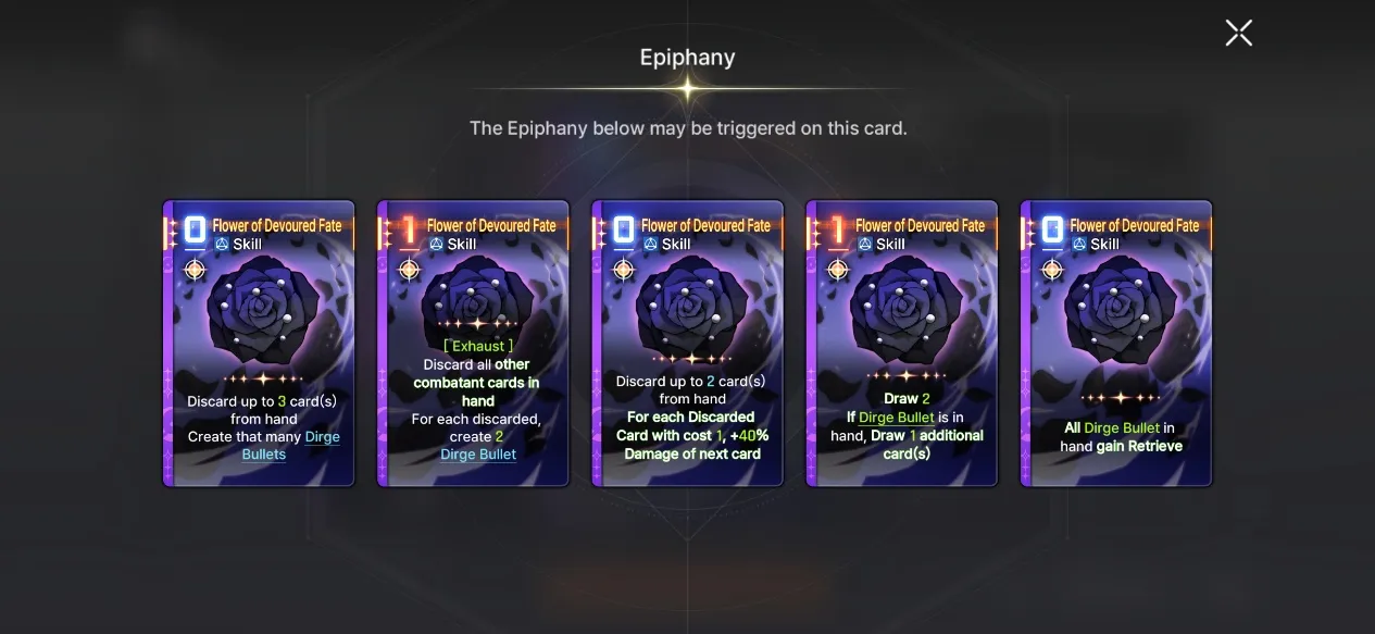 - 貪り食われる運命の花: 0コストの驚異的なスキル。これにより、手札のカードを捨てて同数のダージ弾を生成することができます。弾自体を破棄して新しい弾を作成することもでき、「弾の再生」を可能にすると同時に破棄ダメージを引き起こします。これが彼女のサイクリングとコンボの可能性の鍵となります。