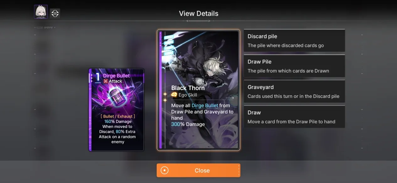 - 効果: エゴポイントを4消費し、300%のダメージを与え、 すべてのゾーン(パイルを引くとパイルを捨てる)からすべてのダージ弾を手札に戻します。