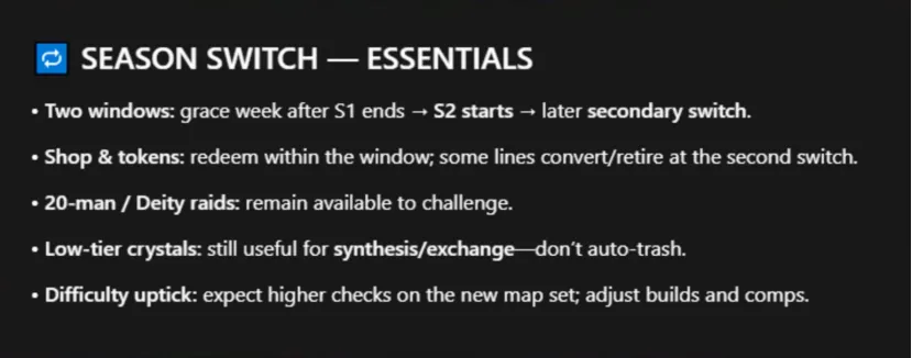 CN クライアントのこのアップデートは段階的リリース モデルに従っており、シーズンを通してコンテンツが段階的に展開されます。したがって、開発チームはすべてのプレイヤーに対し、シーズン移行前にシーズン 1 専用通貨を使用するようアドバイスしました。