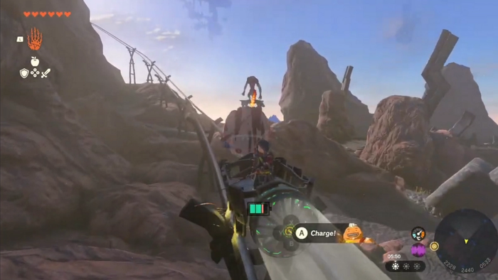 ゼルダの伝説 ティアーズ オブ ザ キングダムでデス マウンテンの西側の頂上に到達するには、特定のレールに乗る必要があります。 まず、レールの横にあるカートをつかみ、近くにある扇風機を後ろに取り付けて、乗り始めます。 さまざまな乗り物に乗ると、目の前で Yunobo が自動的に充電されます。 垂直に狙うことはできませんが、リンクが向いている場所から前方に移動します。 ユノボの能力を利用して、道をふさぐ岩を破壊し、途中の敵を排除します。