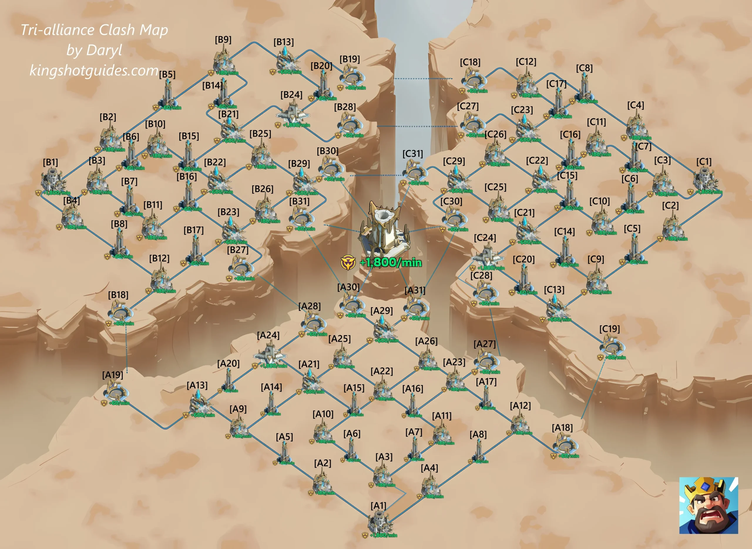 Tri-Alliance Clash マップは 3 つのセクションに分割されており、同盟はそのいずれかから開始できます。各同盟はそれぞれの時点から始まります 本社(A1、B1、C1)