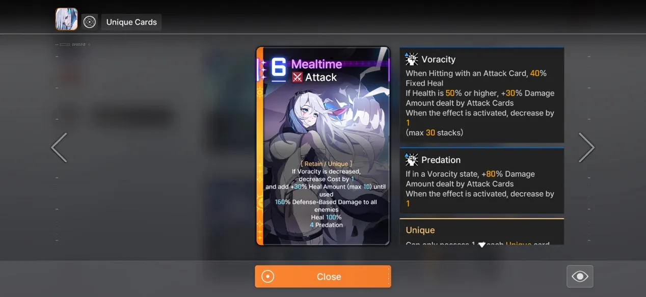 - 貪欲さ 彼女の基本的なメカニックです。味方が攻撃カードを使用すると、Voracity の各スタックにより、その 1 つの攻撃インスタンスに 30% のダメージ ボーナスと 40 ポイントの固定回復が与えられます。各ヒットは 1 スタックを消費します。