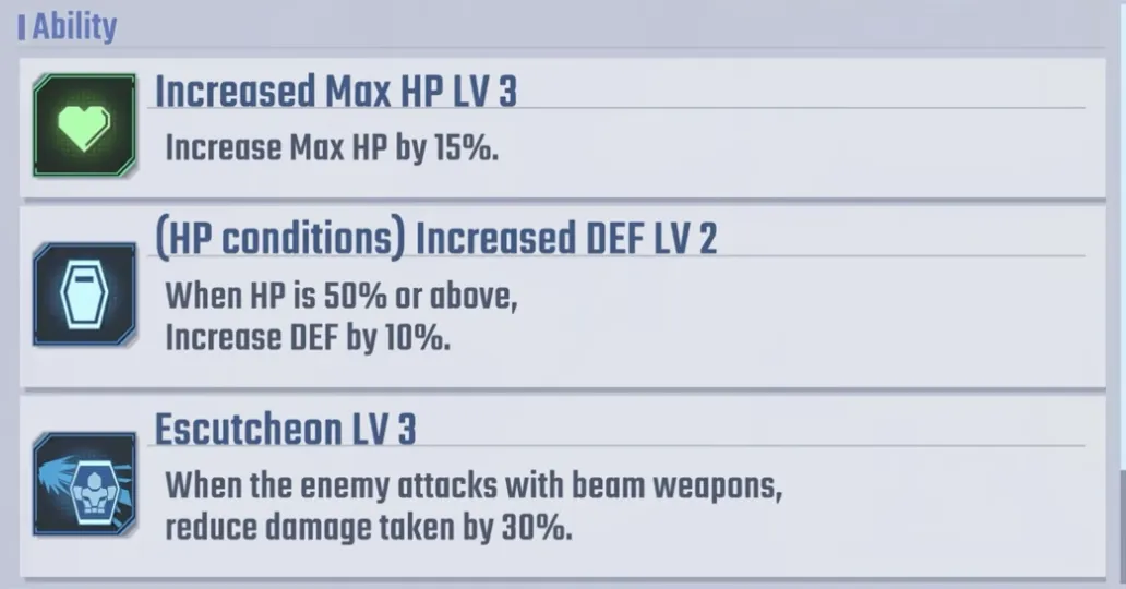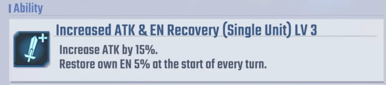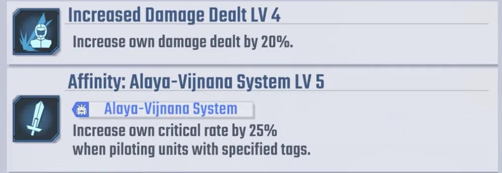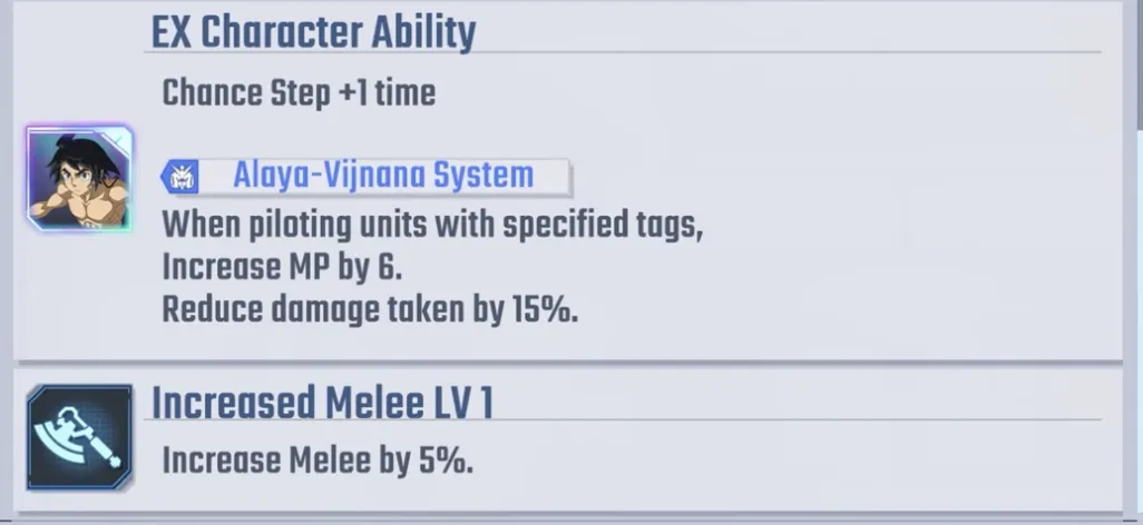 彼の能力には、20% のダメージ増加、25% のクリティカル率ブースト、および Alaya-Vijnana システムを備えたユニットを操縦する際の特別ボーナスが含まれます。