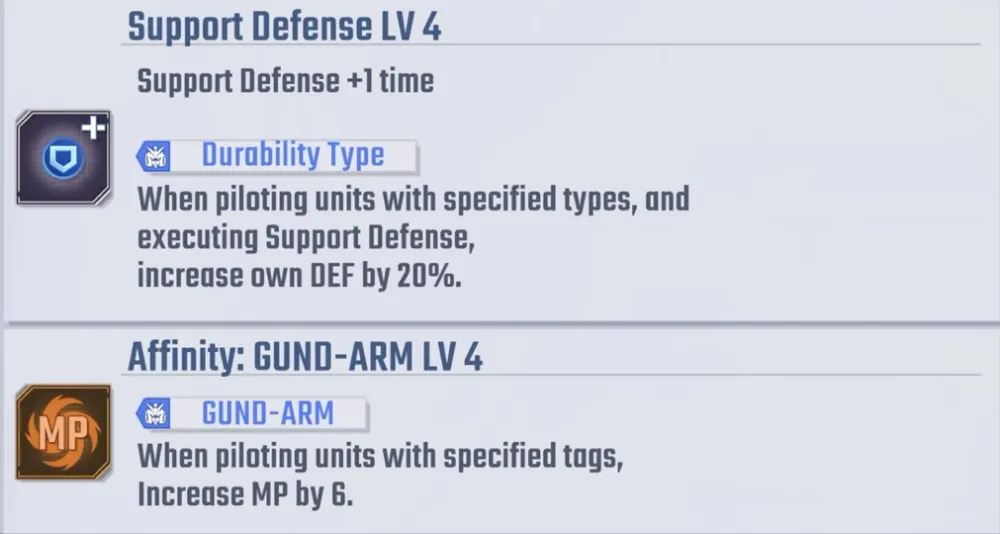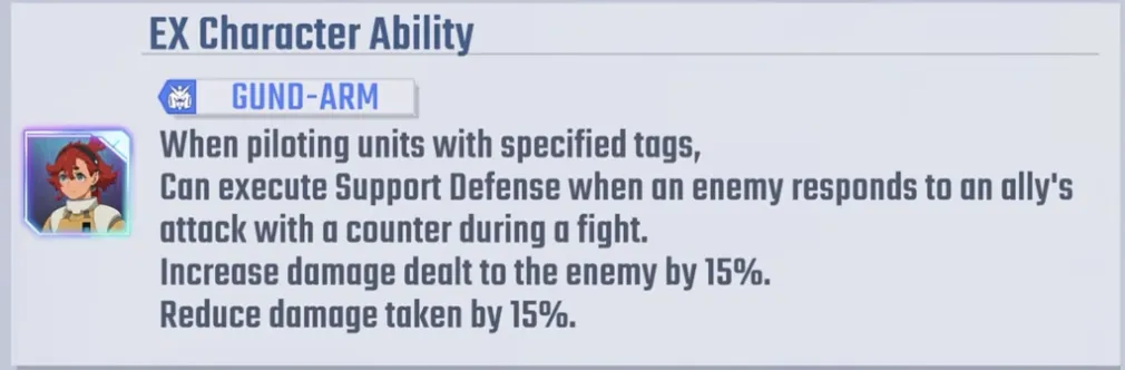 彼女のEXアビリティは非常にユニークで、GUND-ARMタグを持つユニットを操縦すると、味方の攻撃が敵から反撃されたときに支援防御を実行できます。