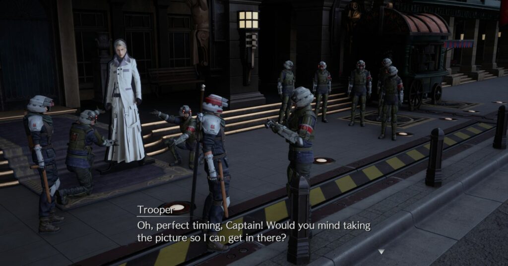 この更新されたバージョンでは、クラウドは正式なパレード ルーチンに参加するだけでなく、神羅の第 7 歩兵部隊のさまざまな部門の兵士を集めて組織するという任務も負っています。