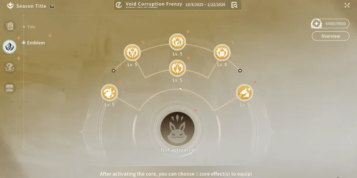 - 合計ノード レベルが 30 に達すると、プレイヤーはエンブレム コアのロックを解除し、エンブレム パワー パーツ、バウンド ルノ、シーズン ポイントを使用してレベルアップします。