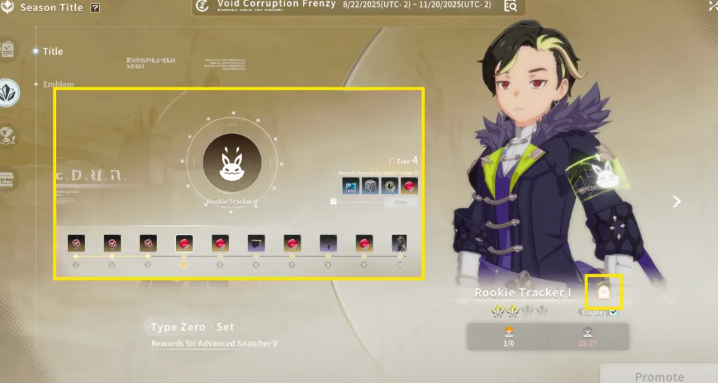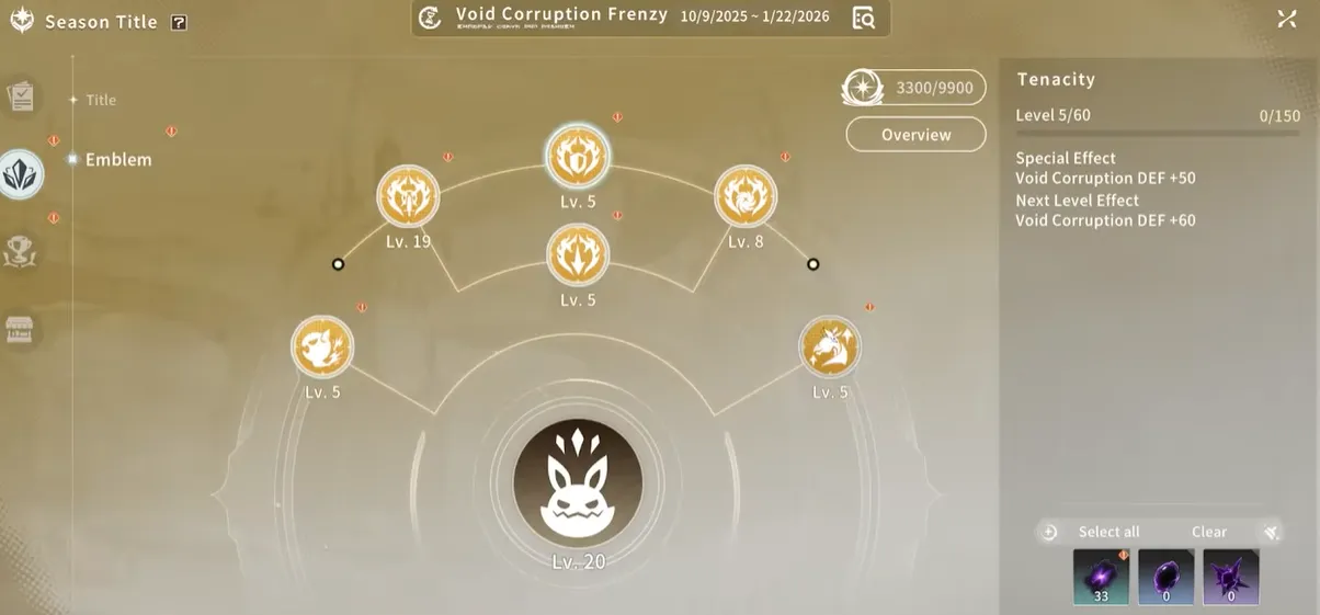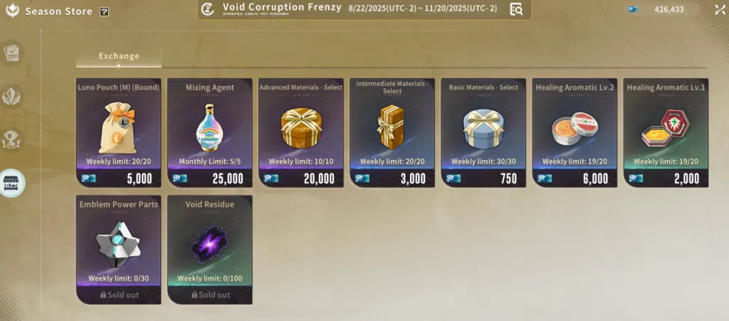 - Void Residue、Void Aura などのエンブレム シーズン マテリアルは、シーズンがリアルタイムで進行するにつれて徐々に購入できるようになります。各週の制限はそれぞれ x100 です。