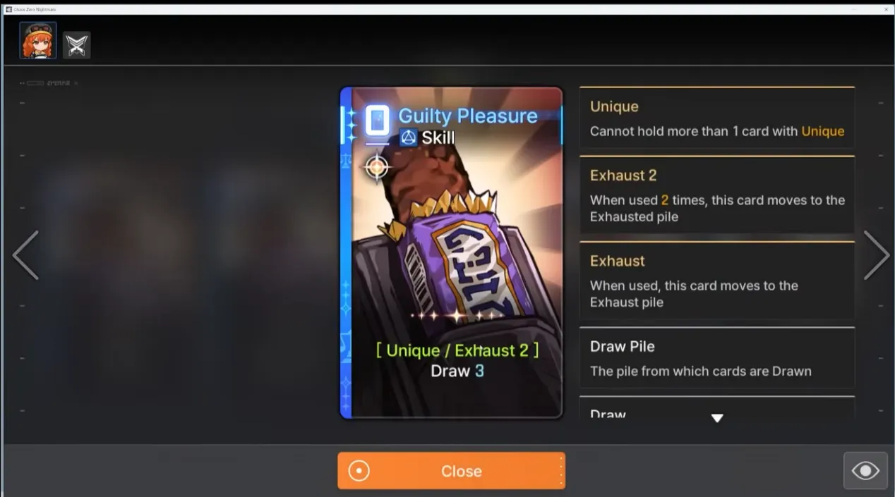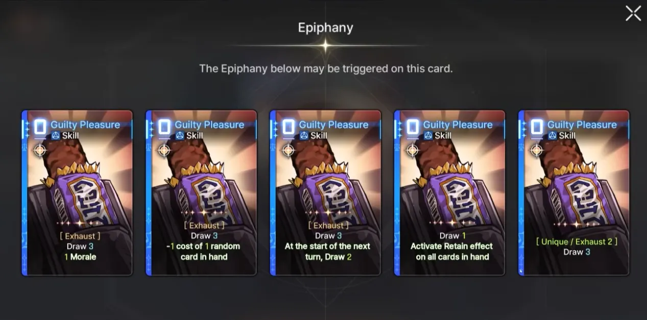 ギルティプレジャー(0コスト): (消費) 使用後すぐにカードを3枚引き、このカードは消費される。その強力なカードドロー機能は、デッキを素早く循環して主要なスキルを検索するのに役立ちます。