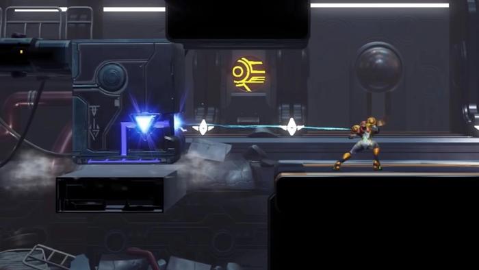 ビームを見つけた部屋を出て、エレベーターでダイロンに戻ります。 ビームを使用してグラップルブロックを破壊し、ボールランチャーに自分を挿入し、ボール爆弾を使用して、離れて行きます。 部屋の左上にEMMIゾーンのドアがあります。 それを入力し、スピードブースターを使用してドアの前のブロックを破壊します。
