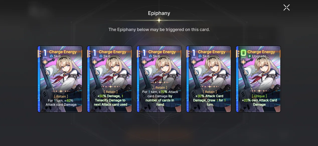 敵全体に180%のダメージを与える。単一のターゲットに 80% の追加ダメージを与えます。特定の条件下でコストが 1 に減り、300% の高価値範囲ダメージを放つことができる「コンボ」エピファニーを選択することをお勧めします。