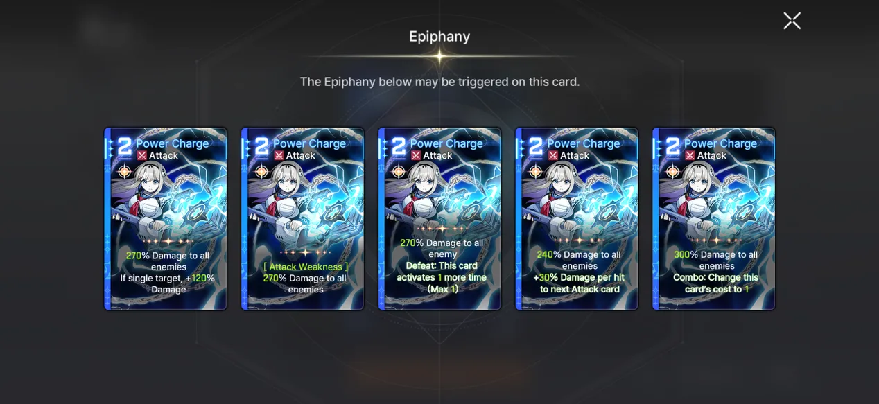 敵全体に180%のダメージを与える。単一のターゲットに 80% の追加ダメージを与えます。特定の条件下でコストが 1 に減り、300% の高価値範囲ダメージを放つことができる「コンボ」エピファニーを選択することをお勧めします。