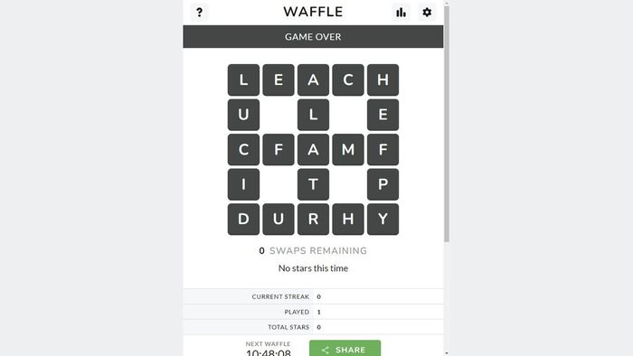 あなたは彼らのウェブサイトでワッフルをプレイすることができます! ゲームの前提は、15回以下のスワップでワッフルを解決することです。 ボード上の任意の場所で文字をクリックしてドラッグできます。 緑はそれらがすでに正しい場所にあることを意味し、黄色はそれらがその単語のどこかに属していることを意味します。配置に応じて垂直または水平になります。 それが隅にある場合、それはどちらの言葉でもあり得ることを意味します。 すべてのワッフルは、10回の移動で解決できる可能性があります。