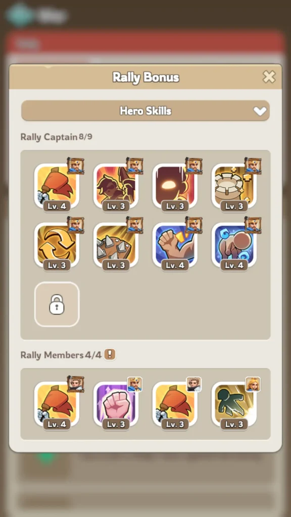 これら 3 人のヒーローの遠征スキルと専用ギア スキルは、ラリーの参加者全員に適用されます。ラリー キャプテンは、各ヒーローから 3 つずつ、合計で最大 9 つのスキルを提供できます。