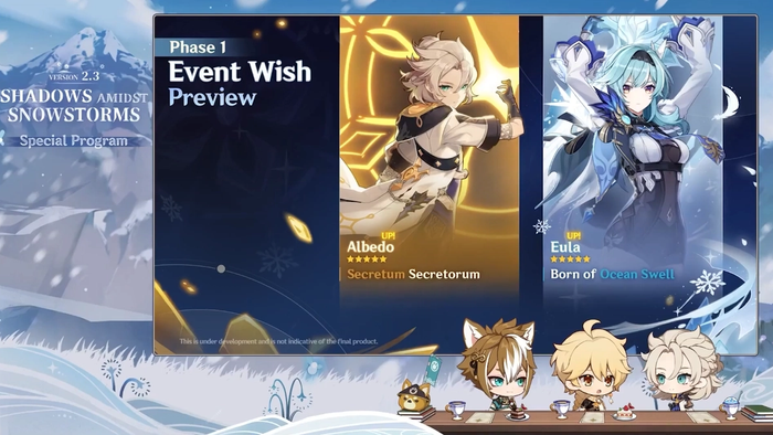 最初のダブルバナーは、バージョン2.3 Shadows Amidst Snowstormsアップデートの前半の一部として、アルベドとユーラを特集します。 個別のカウントシステムを備えているため、Event Wish-2バナーで作成されたウィッシュは、標準バナーまたはアイテムバナーのウィッシュにカウントされません。その逆も同様です。 miHoYoはまた、Event Wish-2バナーは一定のものではなく、たまにしかポップアップしないと述べました。