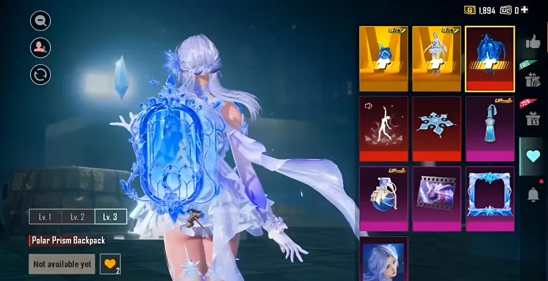 メインの衣装をブルーの色合いと氷のような外観で補完します。バッグはソリッドブルーのクリスタルパネルで形成されており、硬くて鎧のように見えるように宝石が追加されており、エッジはダイヤモンドの形で尖っています。バッグはタフに見えますが、エレガントなアイスデザインがセットに最適です。標準の3レベルにアップグレードします。
