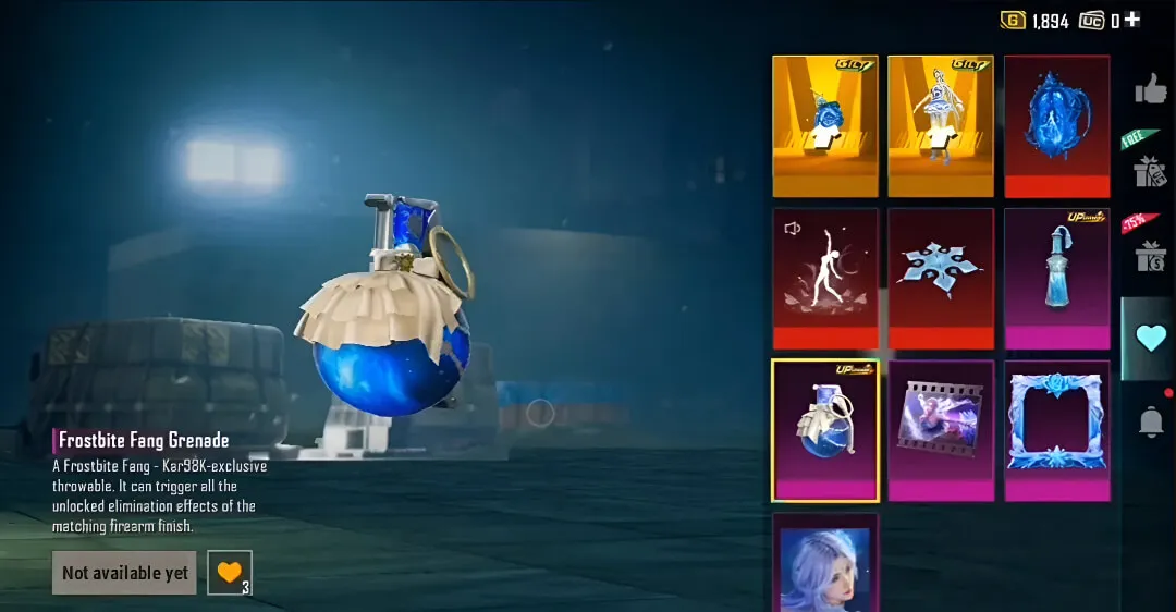 フロストバイト ファング グレネードはフロストバイト ファング Kar98k 専用です。それはクリーム色のスカートが巻かれた深い青色の手榴弾で、金色のリングを引っ張ります。見た目はエレガントですが、他の手榴弾と同様の爆発力を持っています。