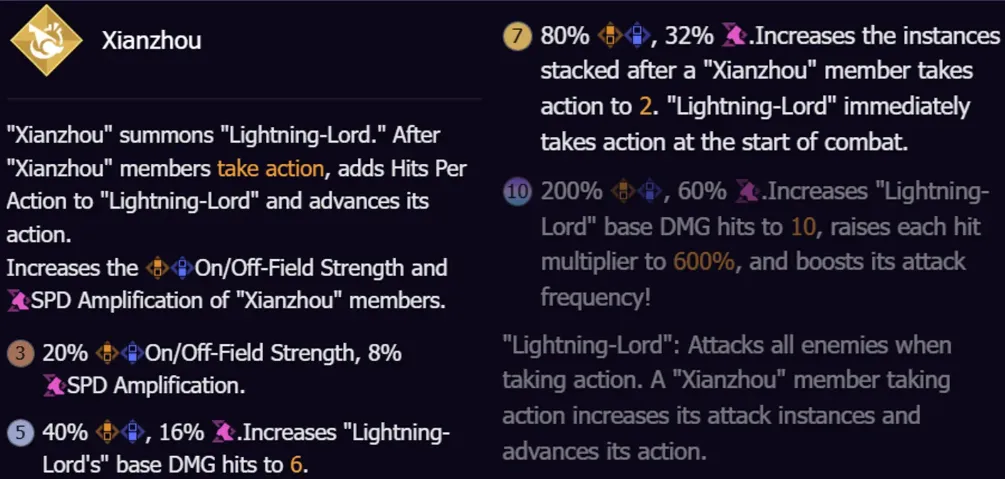 ここで、Qingque が Xianzhou 派閥の部隊であるという事実を追加すると、これがどのような方向に向かうかがわかります。 Xianzhou の味方がアクションを取るたびに、Lighting-Lord はスタックを獲得して前進し、ダメージとターン頻度の両方を増加させます。 Qingque の継続的なタイル描画は、彼女自身のバーを動かすだけでなく、Lighting-Lord スタックにも供給し続けます。 彼女を、スーパーチャージされた範囲ダメージを繰り返し発射する「ライトニングロードランチャー」に変えます。