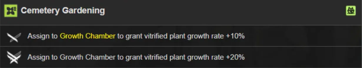 成長室の割り当て: ガラス化植物の成長率 + 10% を付与します (スキルがレベルアップすると +20% に増加します)。