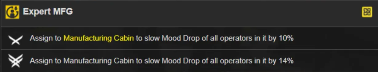 製造キャビン割り当て: キャビン内のすべてのオペレーターの気分低下を 10% 遅くします (スキルがレベルアップすると 14% に増加します)。彼女は生産と基地管理の両方にとって貴重なオペレーターです。