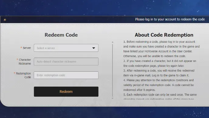 システムエラーまたはバグ: ゲームサーバーに時折問題が発生し、特にアップデート後に引き換え機能が異常となる場合があります。数時間待ってから再試行するか、HoYverse カスタマー サービス (ゲーム内の「フィードバック」または公式 Web サイト) に連絡して、引き換えコードと失敗した試行のスクリーンショットを提供してください。