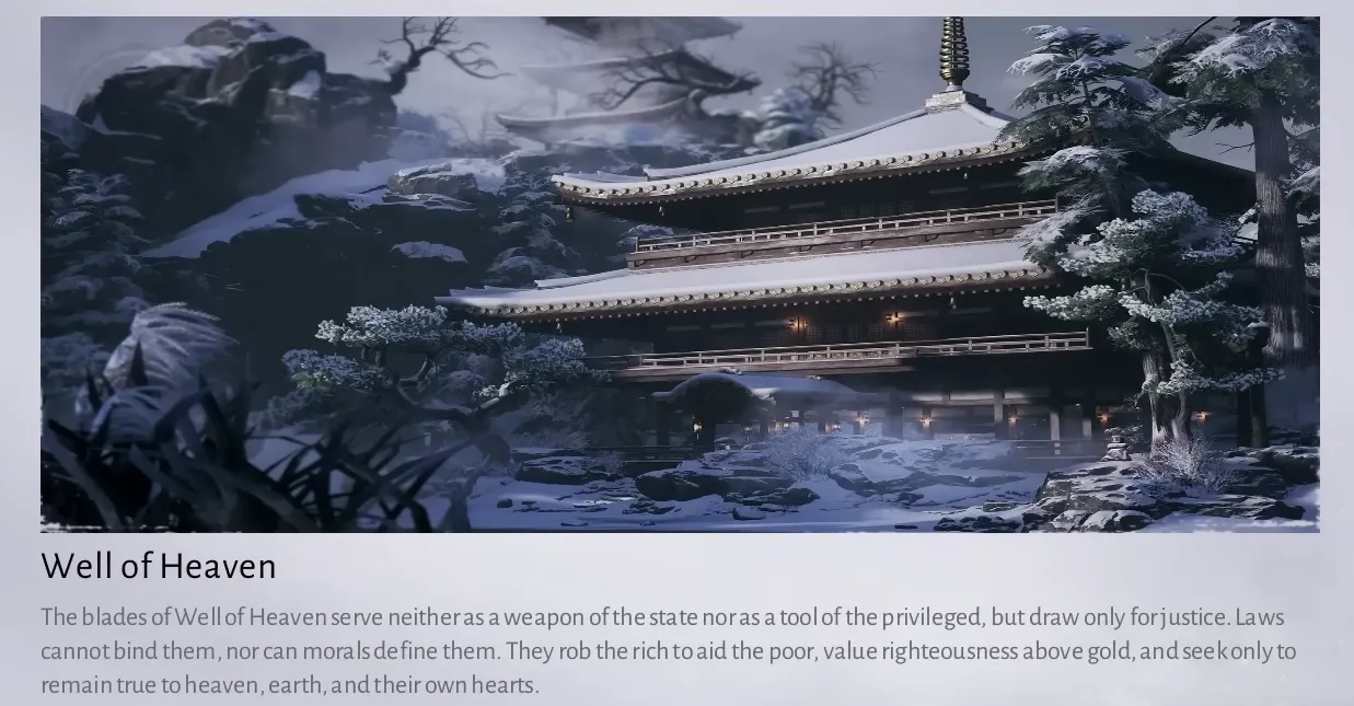 プレイヤーは、マップ上で Well of Heaven の指導者であると主張する、Nine Mortal Ways の弟子たちに遭遇することがあります。彼らの任務を完了すると、宗派に参加できるようになります。またはHarvestfall VillagのSan Qianから手がかりを購入します。関連タスクを完了して宗派に参加します。