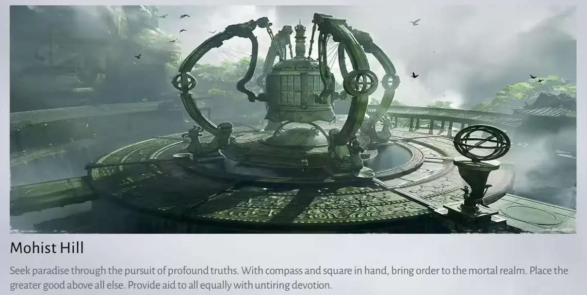 哲学: モヒスト理論に根ざした知識主導の宗派で、発明、戦略、自然の秩序に専念しています。会員は相互利益を通じて真実を追求します。