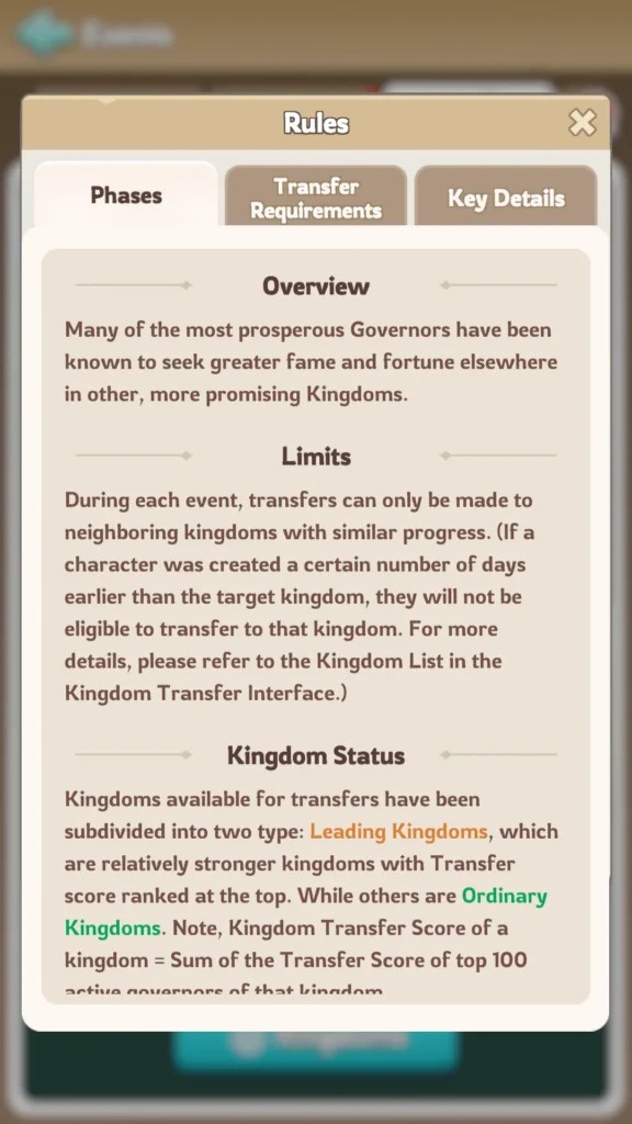 イベント期間中、転送は現在の王国と同様の進捗状況にある近隣の王国にのみ利用できます。これは次のことを意味します