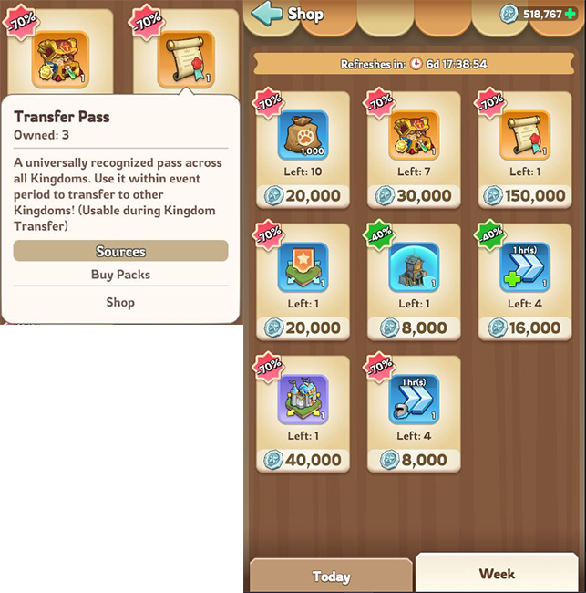 - 毎月 5 ~ 50 ドルのパックを購入し、乗り換える場合に備えてパスを節約してください。 Transfer Pass あたりのコストが大幅に安くなります。王国からすぐに脱出したい場合のみ、100 ドルのパックを購入してください。