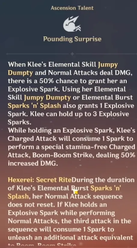 方法に根本的な変更が加えられました 爆発的な火花を入手して利用します。 彼女のエレメンタル スキルとエレメンタル バーストを使用すると、スパークも確実に付与されるようになり、彼女が保持できる最大数は 3 に増加しました。さらに重要なのは、エレメンタル バースト「スパークス アンド スプラッシュ」の継続中、クレーの通常攻撃シーケンスはリセットされません。シーケンスの 3 番目の攻撃を実行すると、自動的に 1 つのスパークを消費して、スタミナフリーの特別なチャージ攻撃をトリガーします。これは、プレイヤーが複雑な通常攻撃からチャージ攻撃コンボを細心の注意を払って実行する必要がなくなり、実際のゲームプレイが大幅に簡素化されることを意味します。