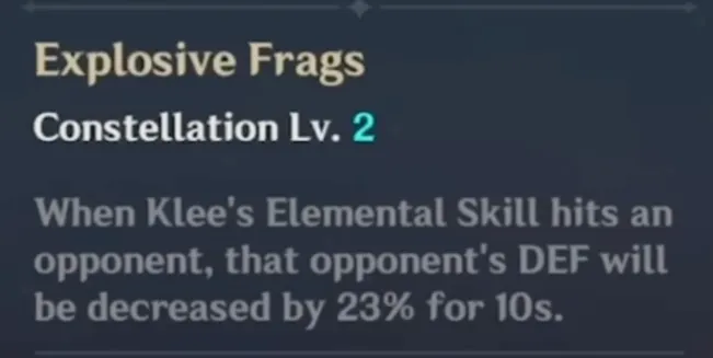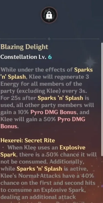 最後に、いくつかの Constellation エフェクトに実用的な調整が加えられました。たとえば、星座 1 には ATK ボーナスが付与され、星座 2 にはスキルで敵を攻撃するだけで DEF 減少が適用され、星座 4 ではバーストが最後に自動的に爆発してダメージが 2 倍になり、星座 6 では追加のパイロ DMG ボーナスが提供され、スパーク消費ロジックが最適化されています。これらの変更により、より上位の Constellation Klee の潜在的なダメージとゲームプレイの快適性の両方が向上します。