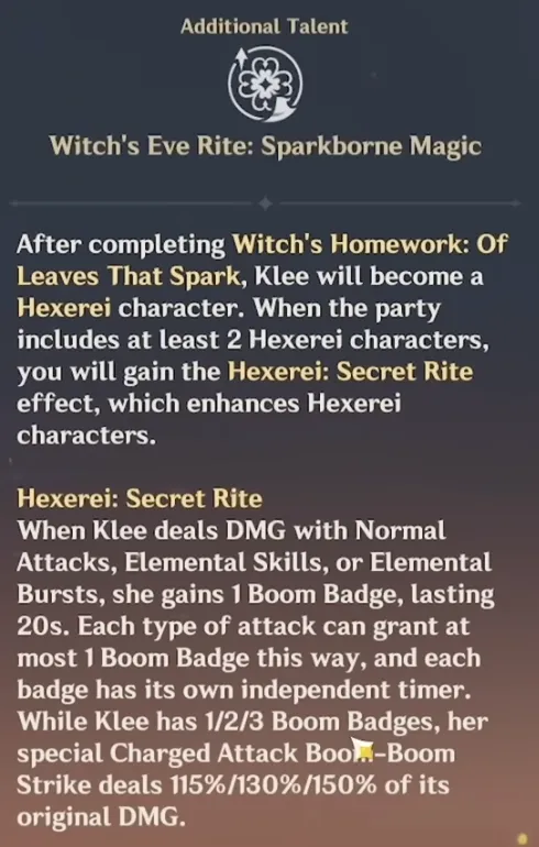「魔女の宿題」クエストを完了すると、クレーはヘクセレイ (魔術) の才能を解放し、新しい戦術システムを獲得します。ただし、これらのヘクセレイの才能は、次の条件が存在する場合にのみ有効になることに注意することが重要です。 パーティにヘクセライキャラクターが2人以上いること。