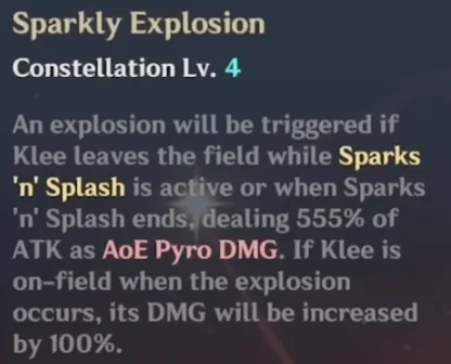 エレメンタルバーストを使用するタイミングがより柔軟になりました。星座4の調整後、「スパークス&スプラッシュ」は自然終了でも爆発し、クレーが場にいるとダメージが2倍になります。これは、プレイヤーが彼女を時期尚早に交換することを心配する必要がなくなったことを意味します。