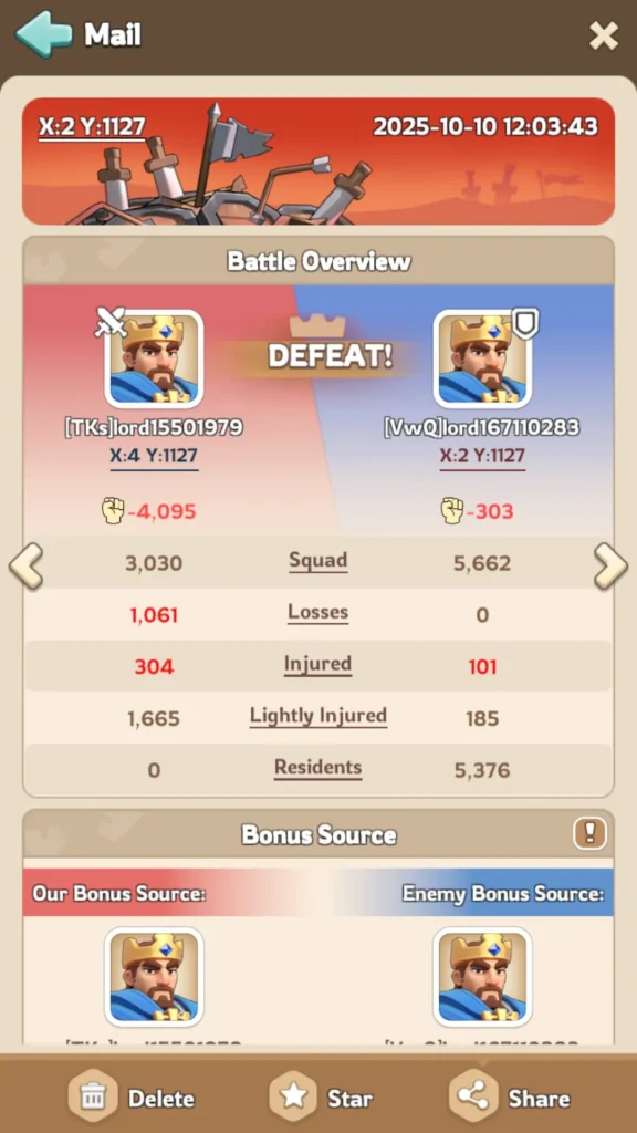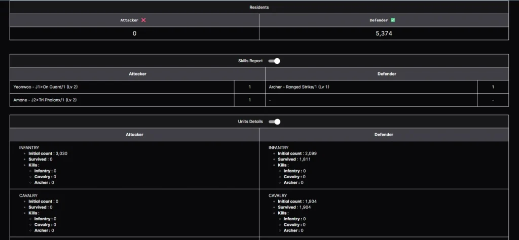 私のミニアカウントでいくつかのテストを実行して、Lethality 結合と Attack 結合がどのように組み合わされるかを示しました。攻撃側と防御側のステータスと兵力はまったく同じにしました。変更したのはジョイナーだけです。